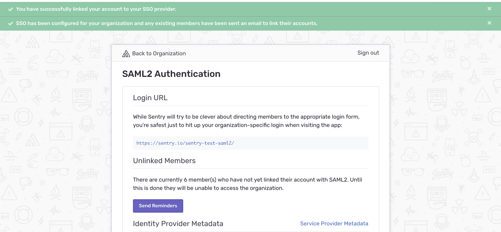 Existing members will receive an email notifying them of the new SAML authentication option once it is turned on (regardless of enforcement) and they'll be able to link the accounts in the IdP system with their Sentry memberships.