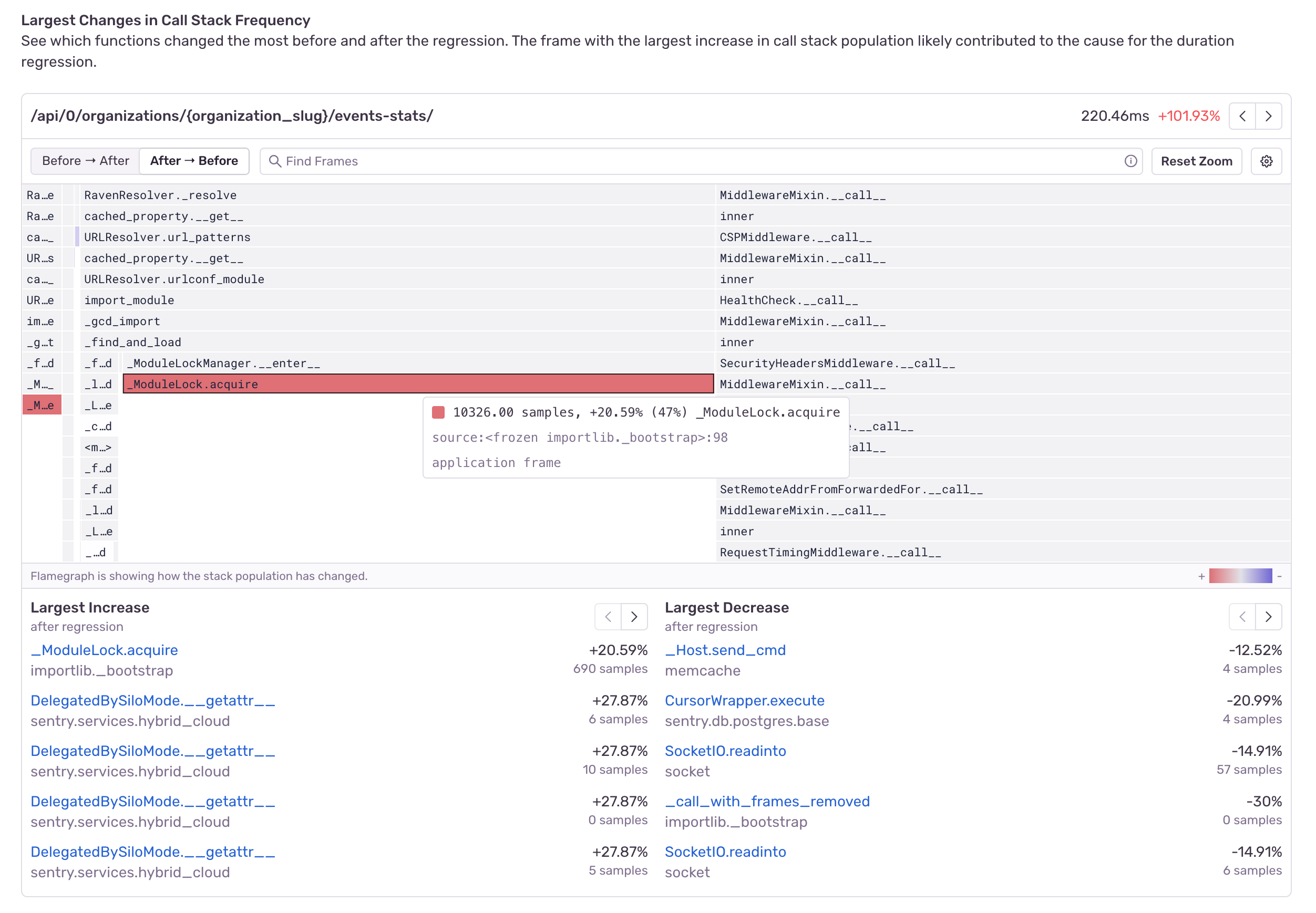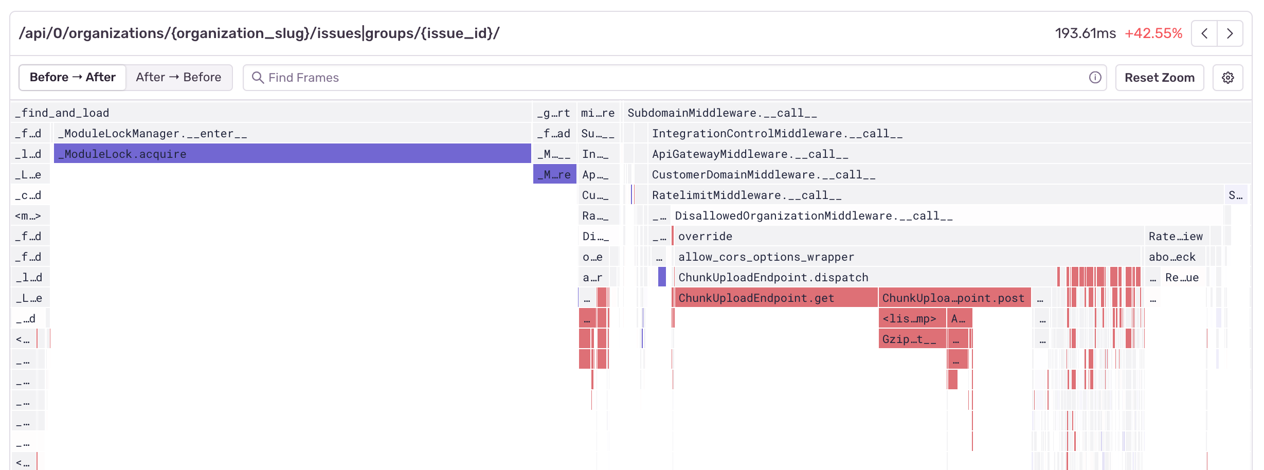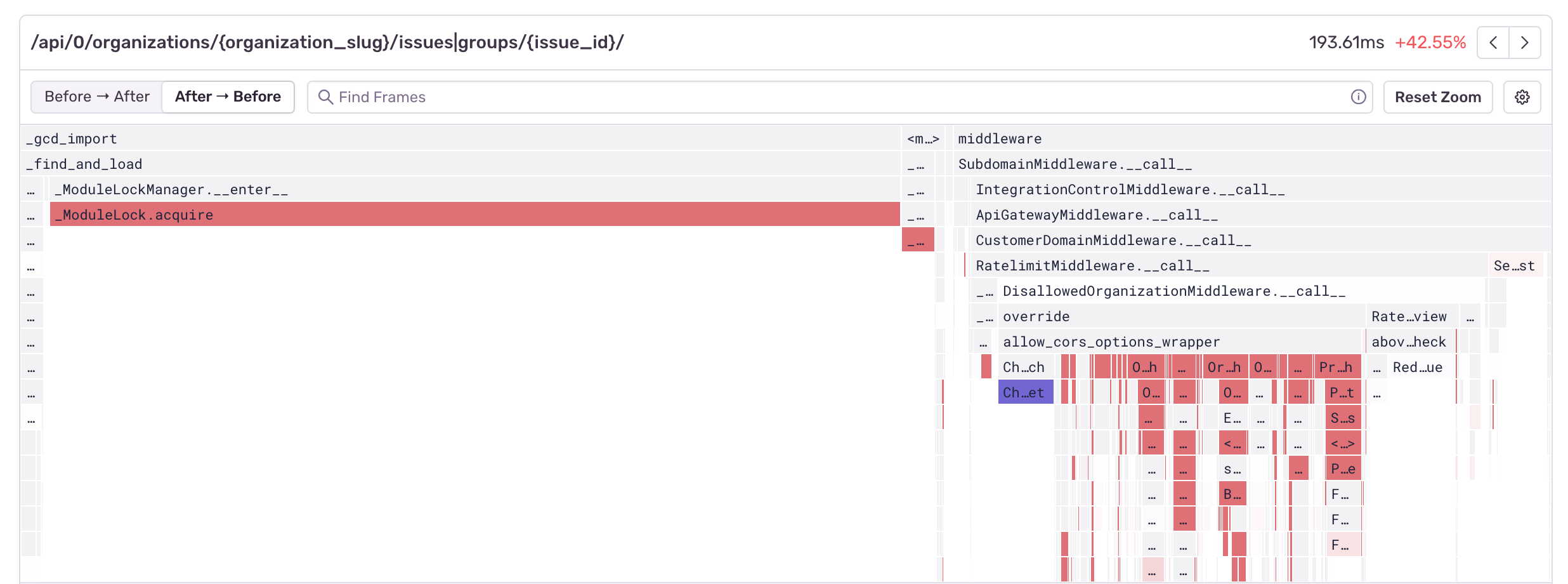 The differential flame graph above is showing that the function call to ModuleLock.acquire