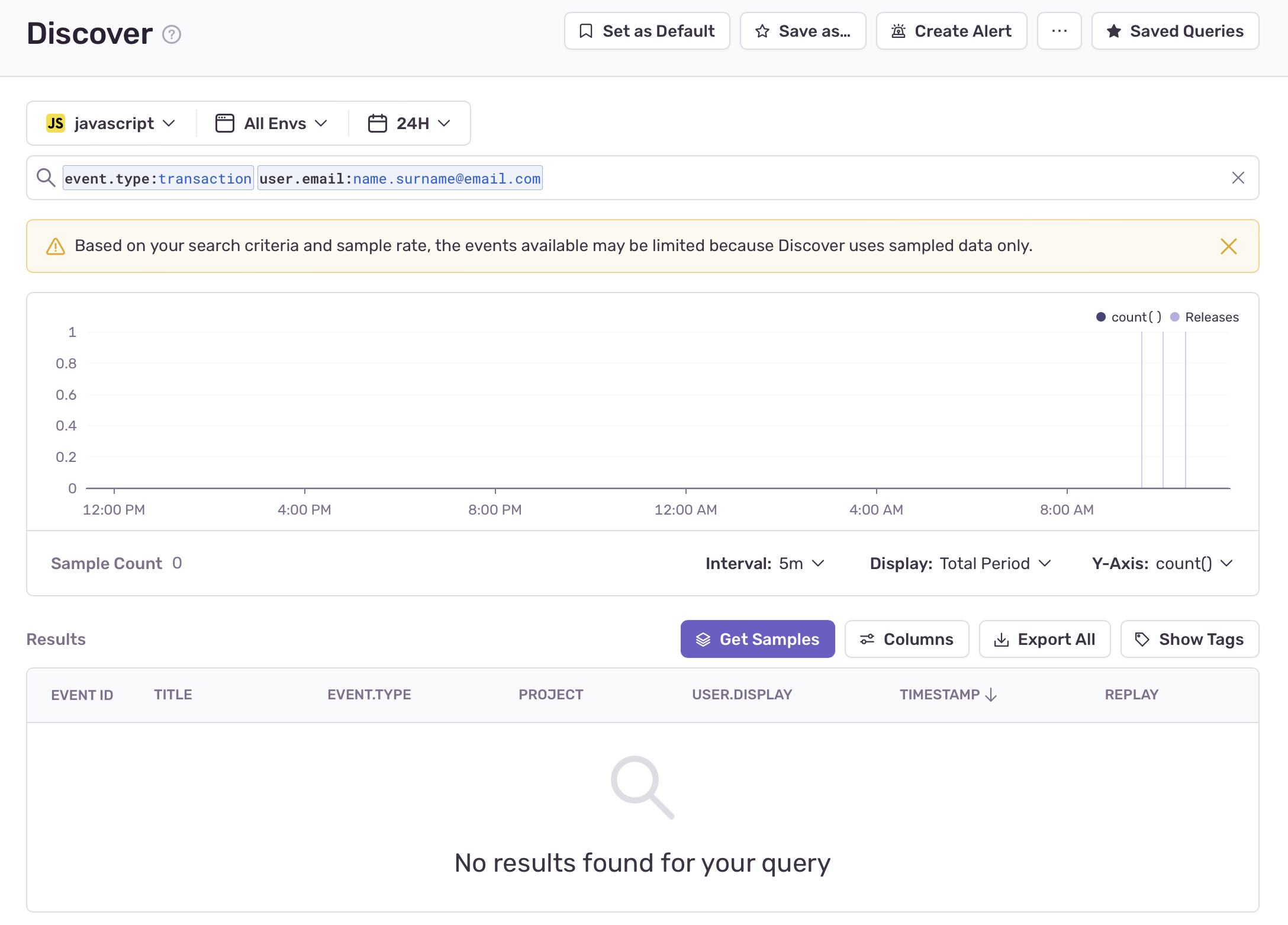 When you perform a query on transactions either in Discover or in Transaction Summary and receive fewer than 5 samples, you can click "Get Samples" to create a new investigation rule to retain more samples of transactions for the respective query.