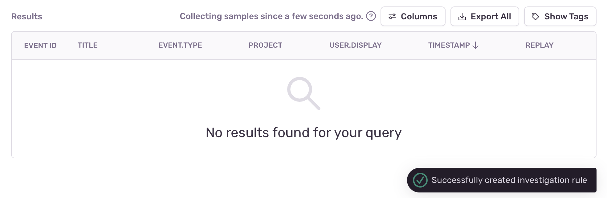 Investigation rules are sampling rules that can be created through the Sentry UI to temporarily boost the number of transactions collected for a particular scenario (for example, transactions with specific tag values). These rules can be created to retain more samples when too few (less than 5) are available. Once created, a rule will be active for up to 48 hours or until 100 samples are collected. You'll be notified via email when enough transactions have been collected.